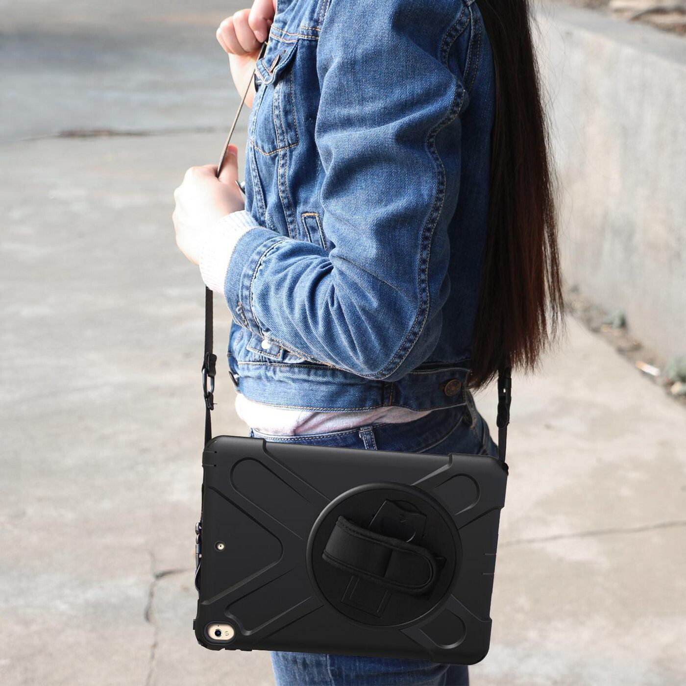 Shockproof cover designed for every day use. It is equipped with a pencil slot as well as a hand strap for a firm grip. Furthermore, it is delivered with a shoulder strap should you wish to carry the tablet in an easy way. The built-in 360° rotatable kick stand makes it possible to use the tablet in both horizontal and vertical position. Built-in air cushion protection safeguards the tablet corners if the tablet is dropped. The raised sides on both the front and around the camera hole offers better drop protection for the camera and the front glass. All buttons are protected, but can easily be operated as well as there is easy access to all ports. The cover does not include a front glass. The cover is a three layer cover with a hard PC inner cover (2 parts) as well as a silicone skin.