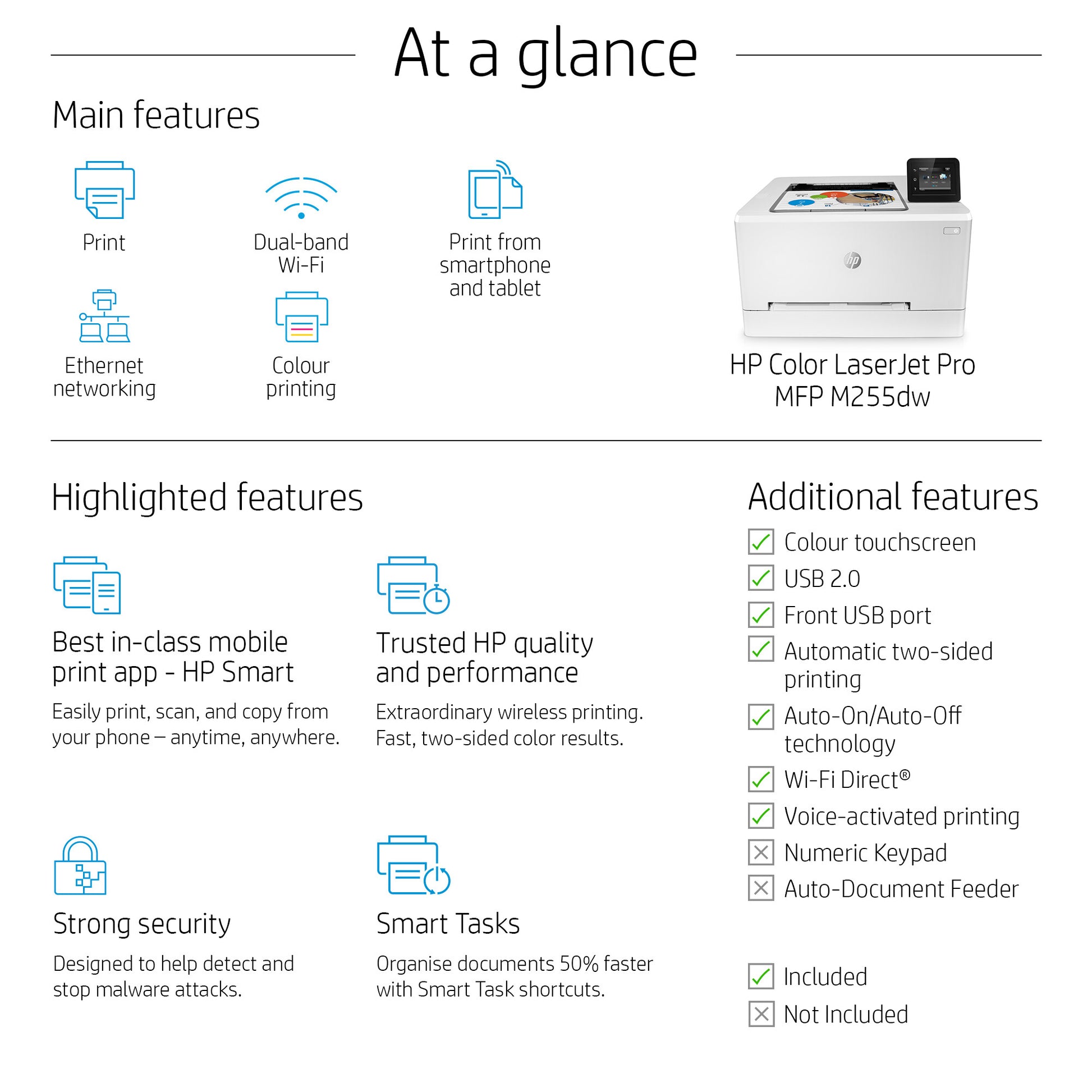| Box contents | HP Color LaserJet Pro M255dw printer; Introductory HP LaserJet cartridges: 700 colour composite (C/Y/M) page yield and 800 page yield black; Installation guide; Power cord; USB cable |
