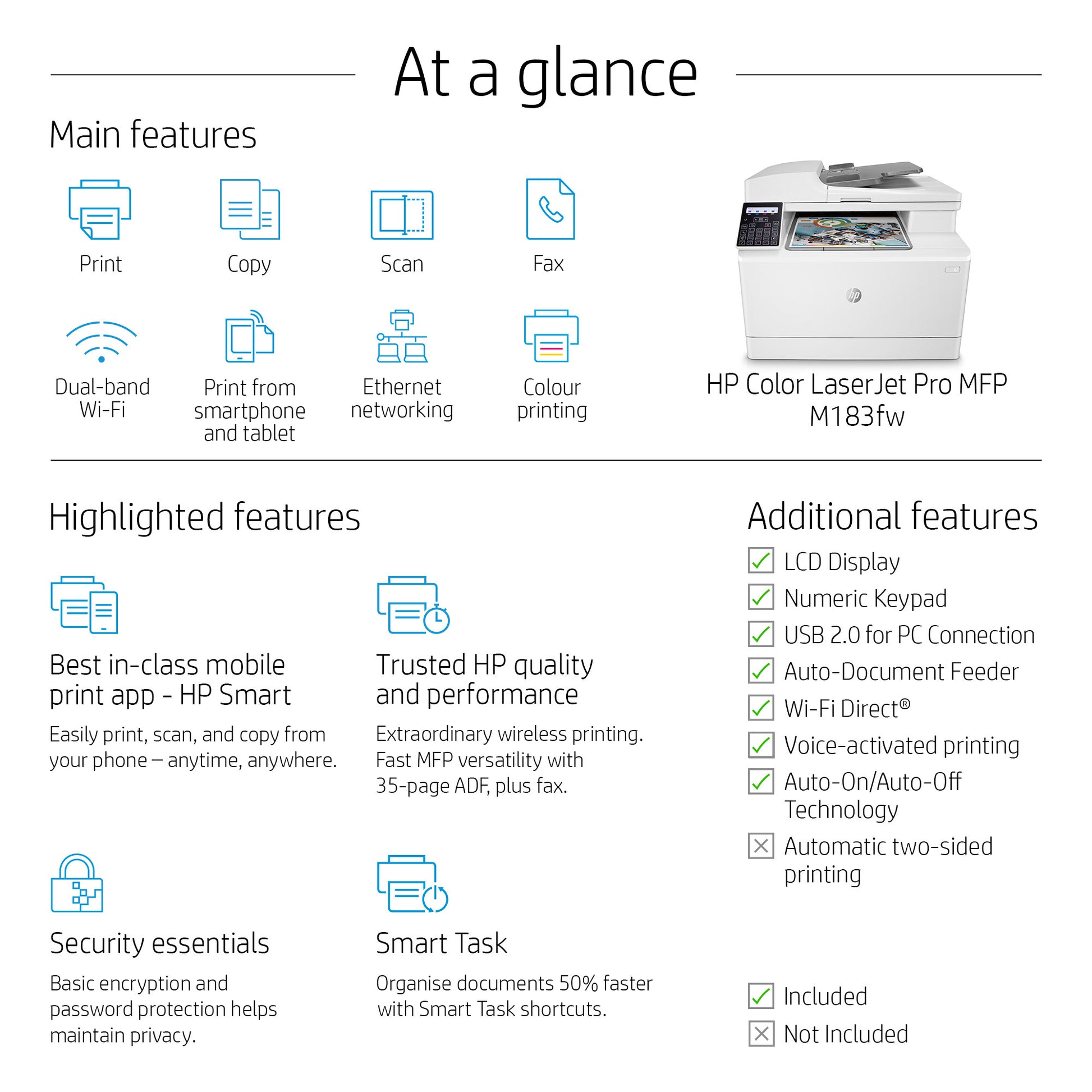 - 35-sheet ADF; Energy Efficient; Strong Security; Dualband Wi-Fi