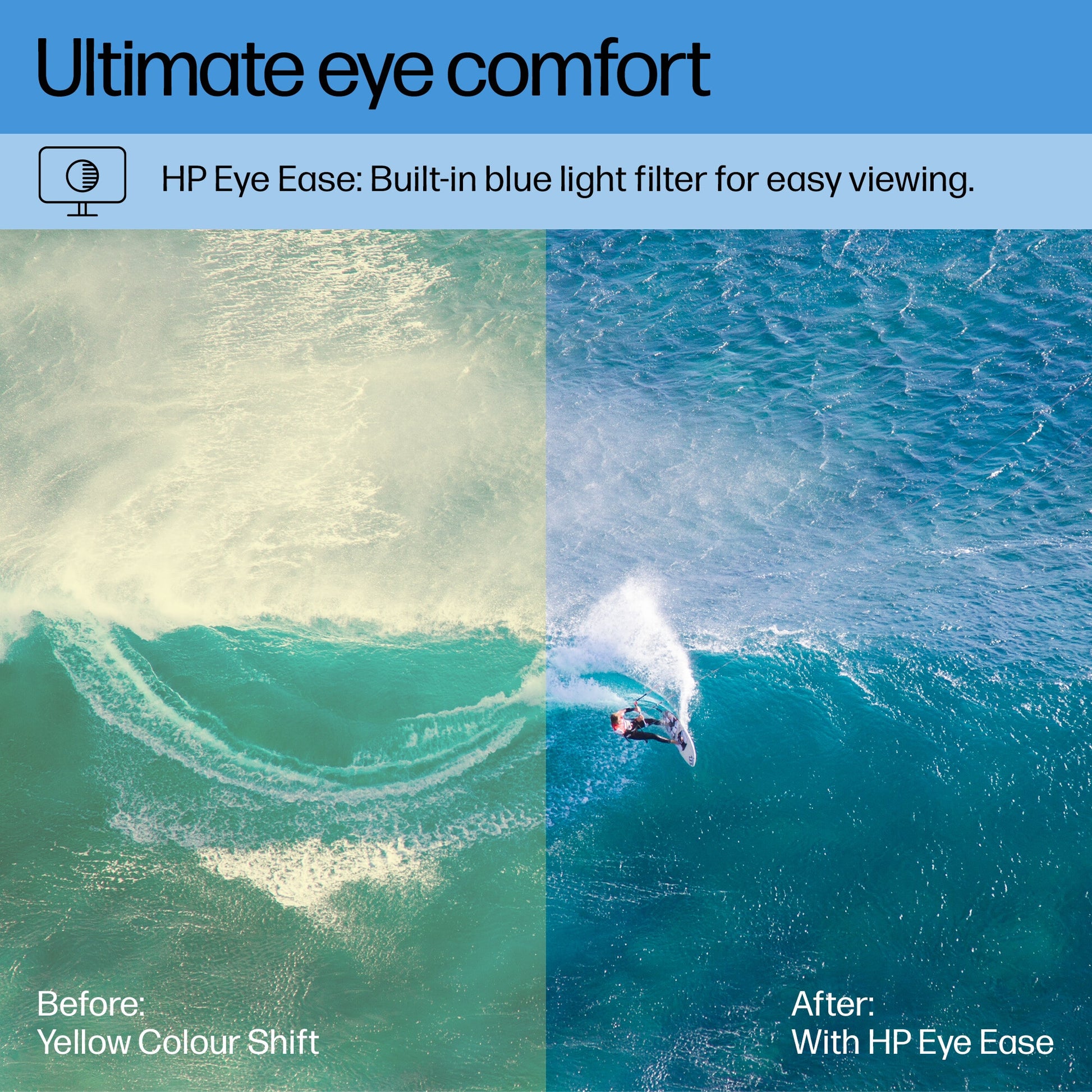 - Keep your eyes comfortable through the work day with HP Eye Ease, our first built-in, always-on blue light filter that has zero impact on your color accuracy and works without an OSD.