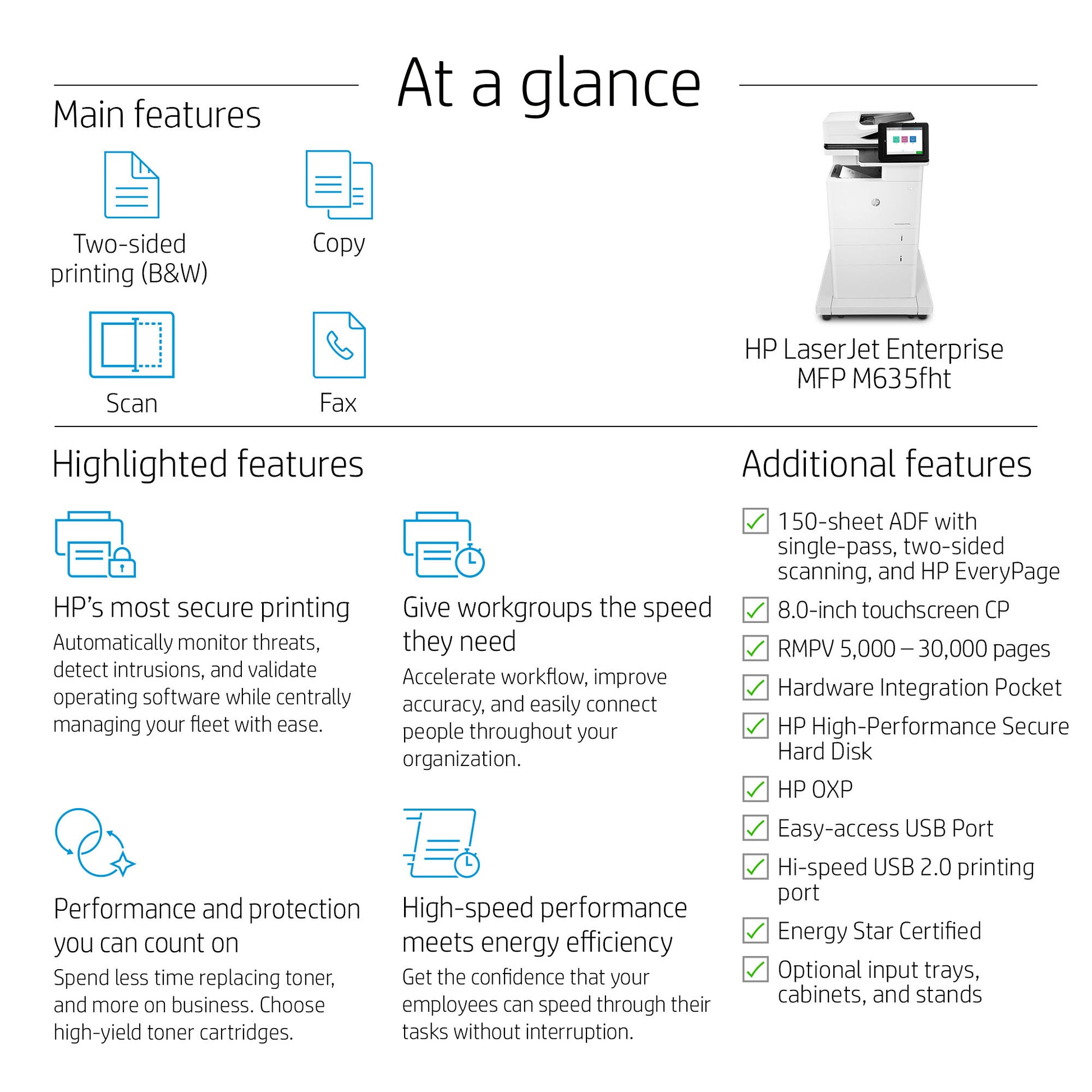 - Front-facing USB printing; Scan to email/PDF; Two-sided printing; 150-sheet ADF; Strong Security