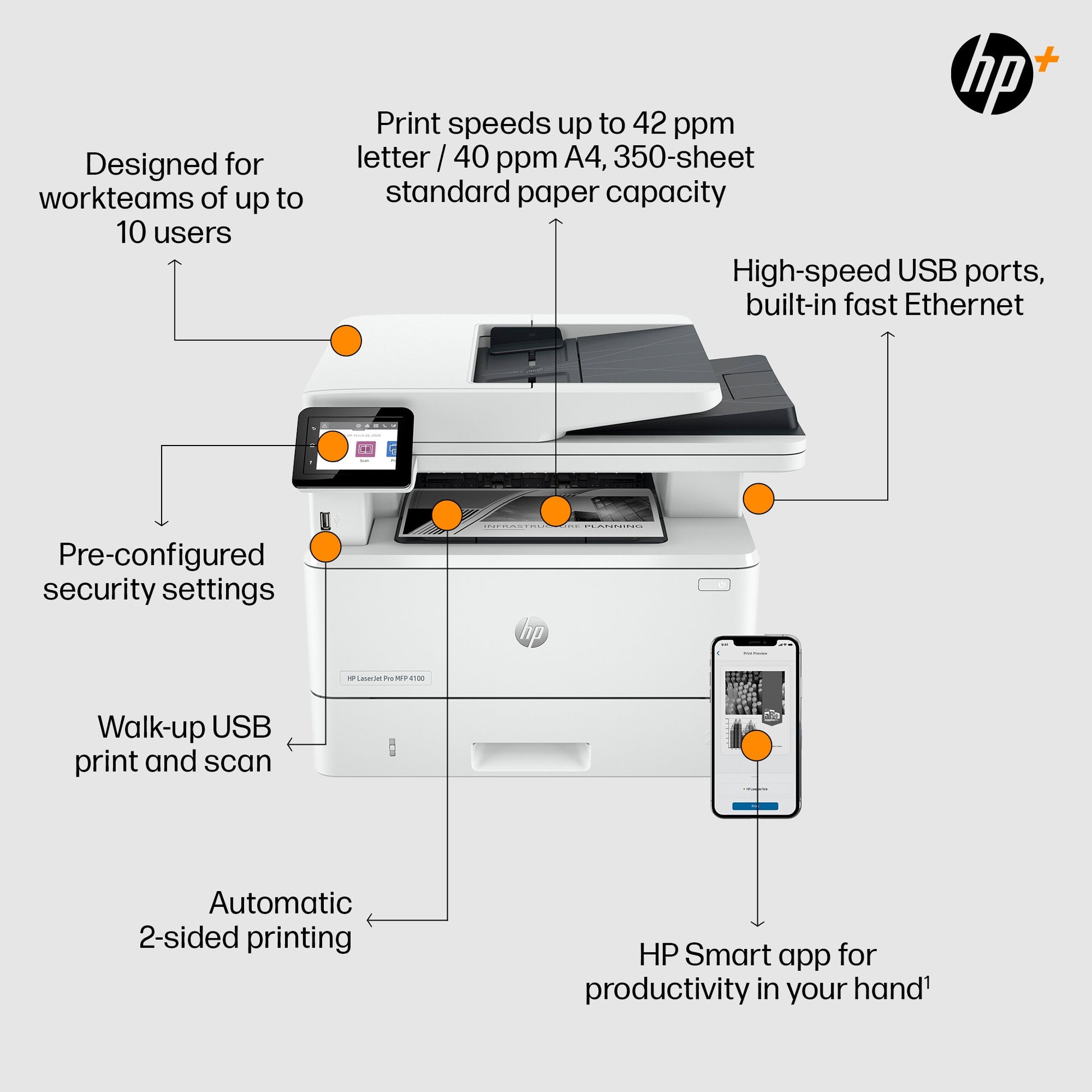 Maximum productivity. Seamless management. Get blazing fast printing speeds, high-volume scanning, and easy management tools with LaserJet Pro.