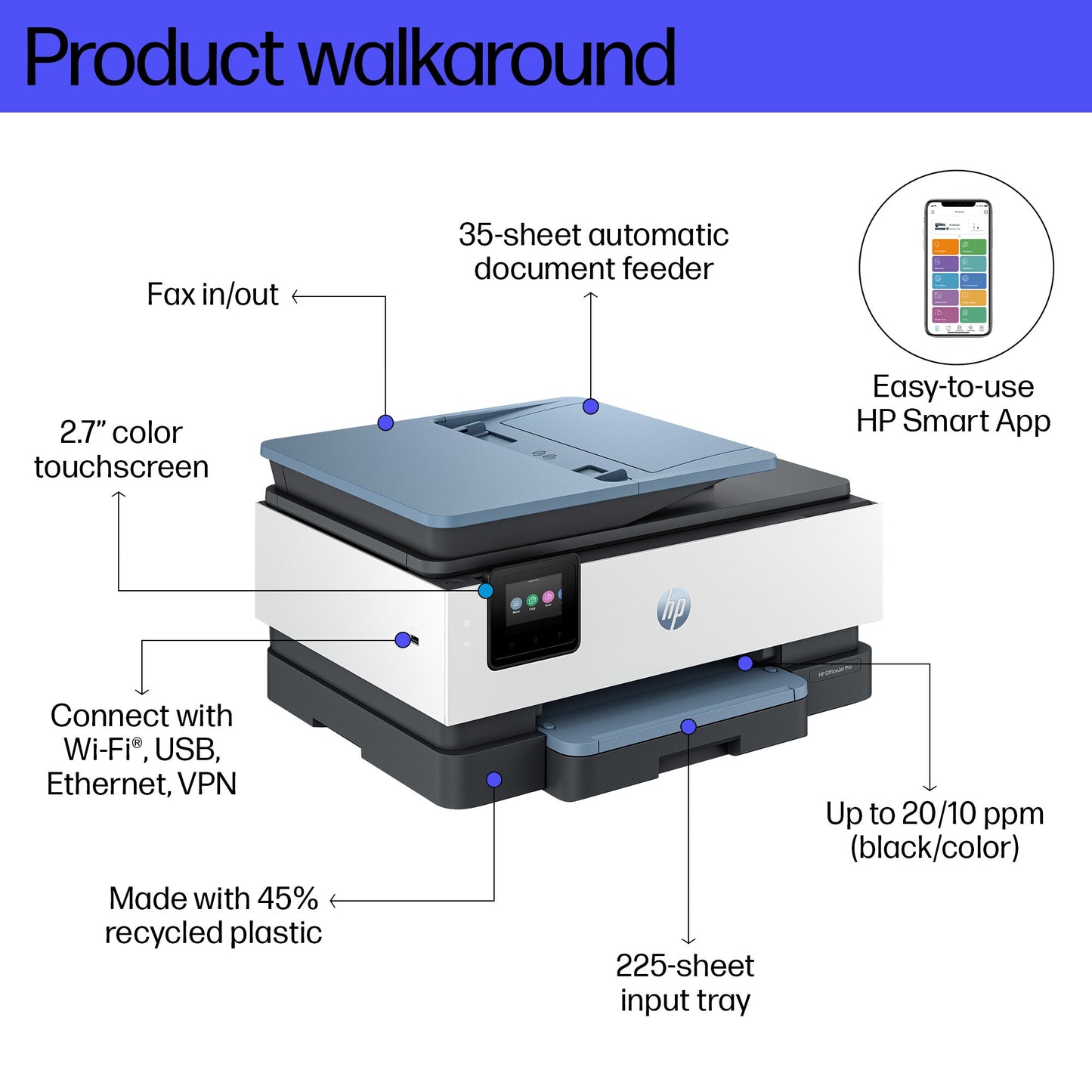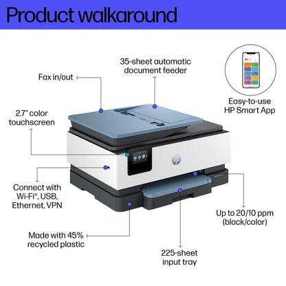 Automatic document feeder; Touchscreen; Smart Advance Scan; Quiet mode; Print over VPN with HP+