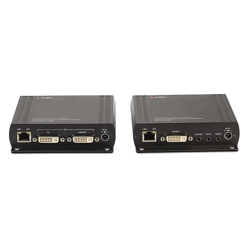 The Lindy Cat.6 DVI-D Single Link, USB, Audio and RS-232 KVM Extender allows users to control a source device such as a PC from a single keyboard, mouse and display up to 140m using a Cat.6 RJ-45 cable. Supports single link resolutions up to 1920x1200 and HDMI signals including Full HD 1080p, 3D and HDCP 1.4. Ideal for KVM applications, the Extender consists of a transmitter and a receiver unit. The transmitter must be connected to a source such as a PC or KVM Switch, while the console with display, keyboard and mouse must be connected to the receiver. It's also possible to connect additional USB 2.0 devices such as storage and hard drives (webcams are not supported).