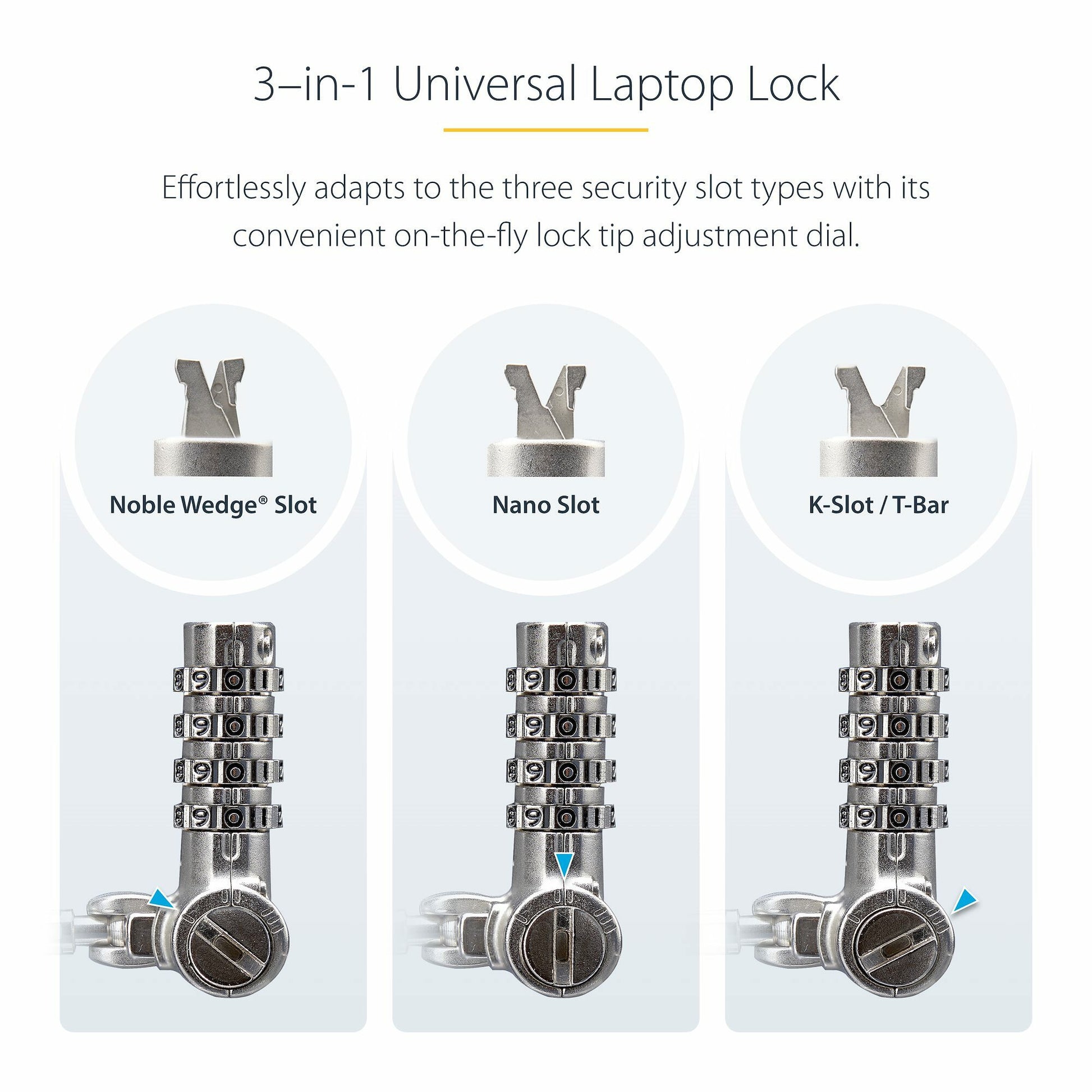 - 25-PACK UNIVERSAL 3-IN-1 LAPTOP LOCK: Compatible with Noble Wedgee®; K-Slot (T-Bar), and Nano lock slots using an adjustable lock tip; 6.6ft (2m) and 0.17in (4.4mm) thick cut-resistant carbon steel cable; Lock can withstand a pull force of up to 202lb