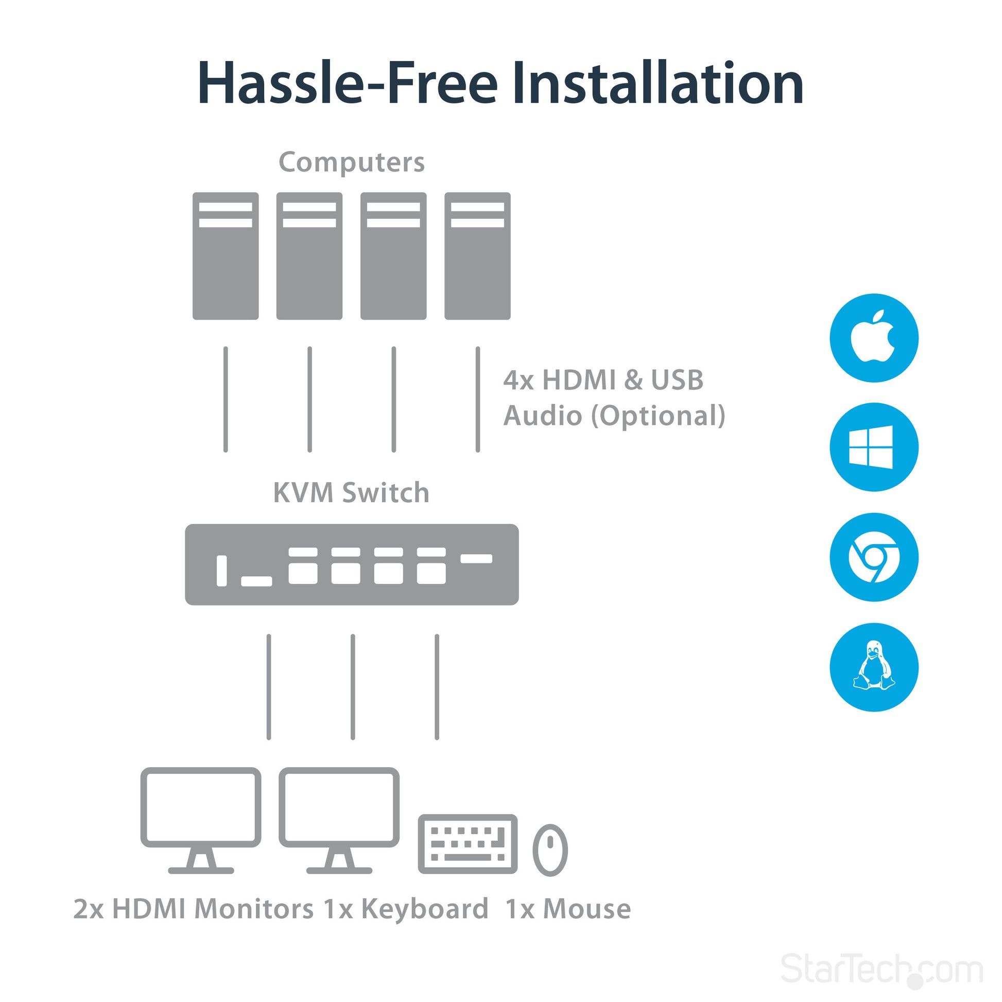 This 4-port HDMI KVM switch lets you control four HDMI computers with a single mouse, keyboard and monitor up to 4K 30Hz. The KVM also features 3.5 mm audio and a built-in 2-port USB 3.0 hub.