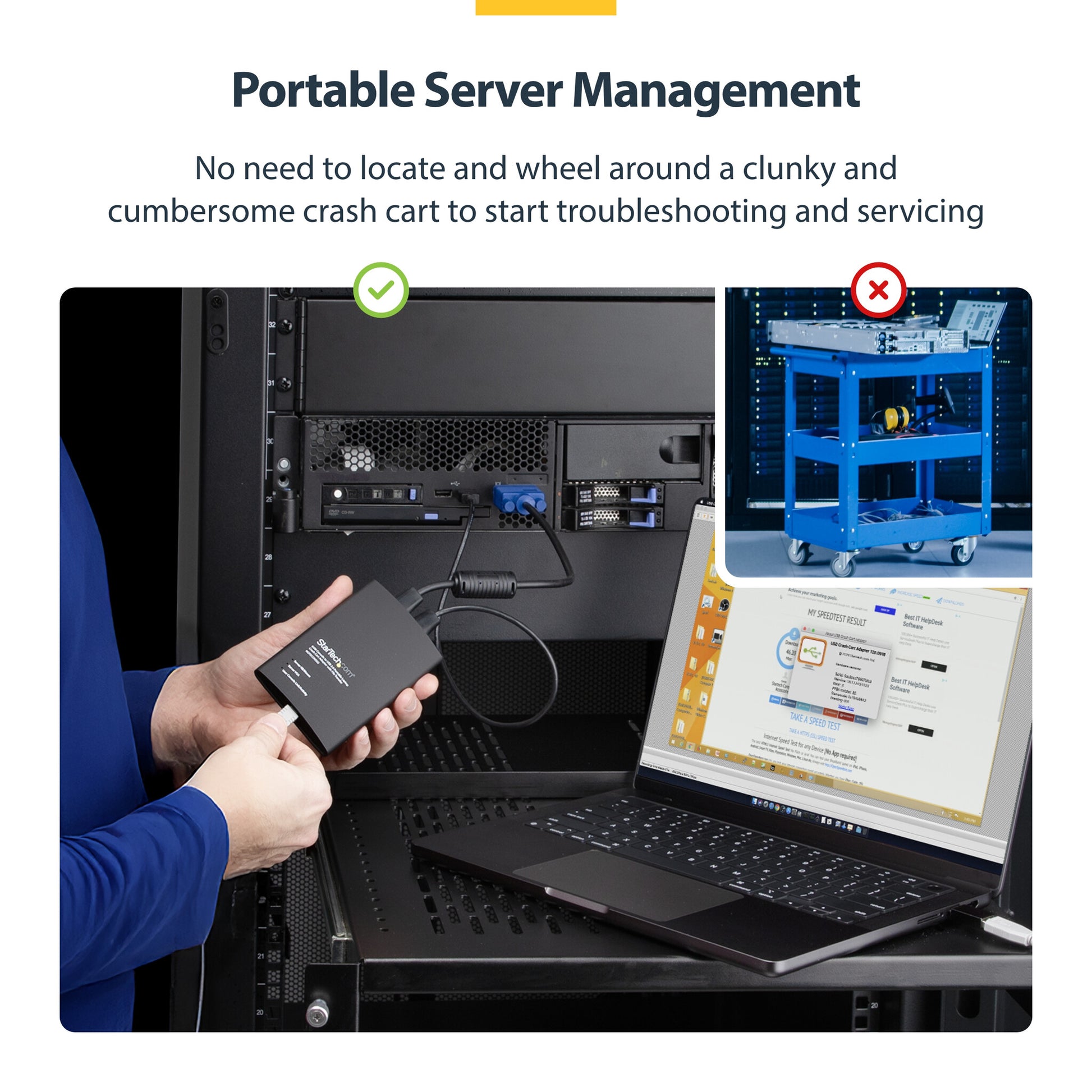 - LAPTOP TO SERVER: USB crash cart adapter connects your laptop to a headless system, turning your laptop into a portable console for rack servers in your server room, PCs, ATMs, kiosks, etc