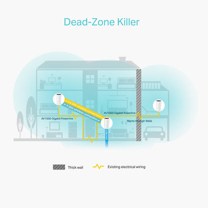 Dead-Zone Killer The hybrid whole-home system delivers extended coverage up to 6,000 ft2 / 560 m2 with the help of the combination of dual-band Wi-Fi and powerline. Eliminate weak signal areas with whole-home Wi-Fi and no more searching around for a stable connection.