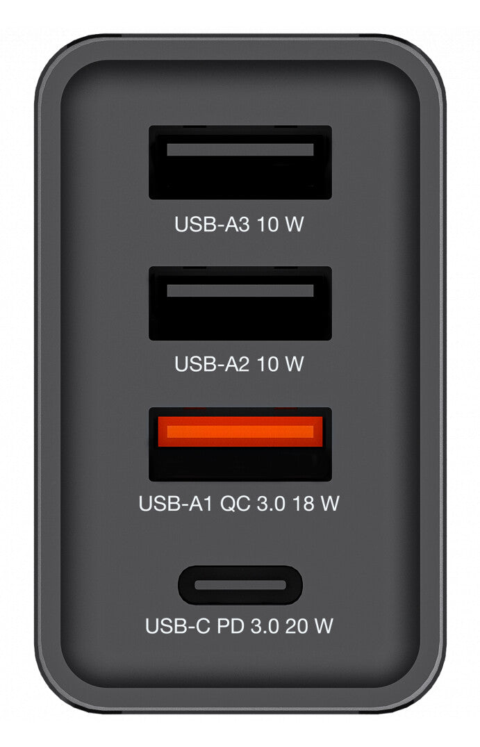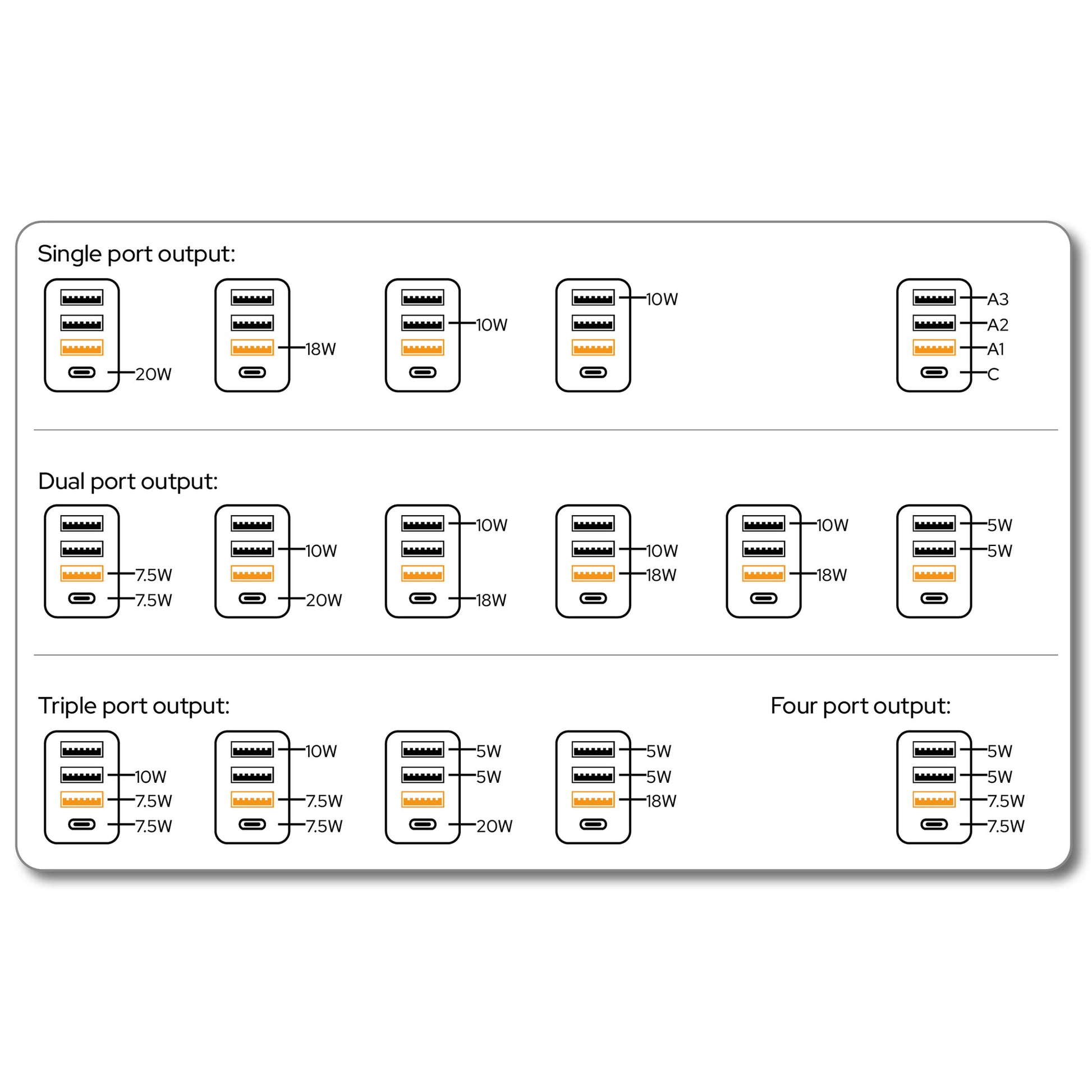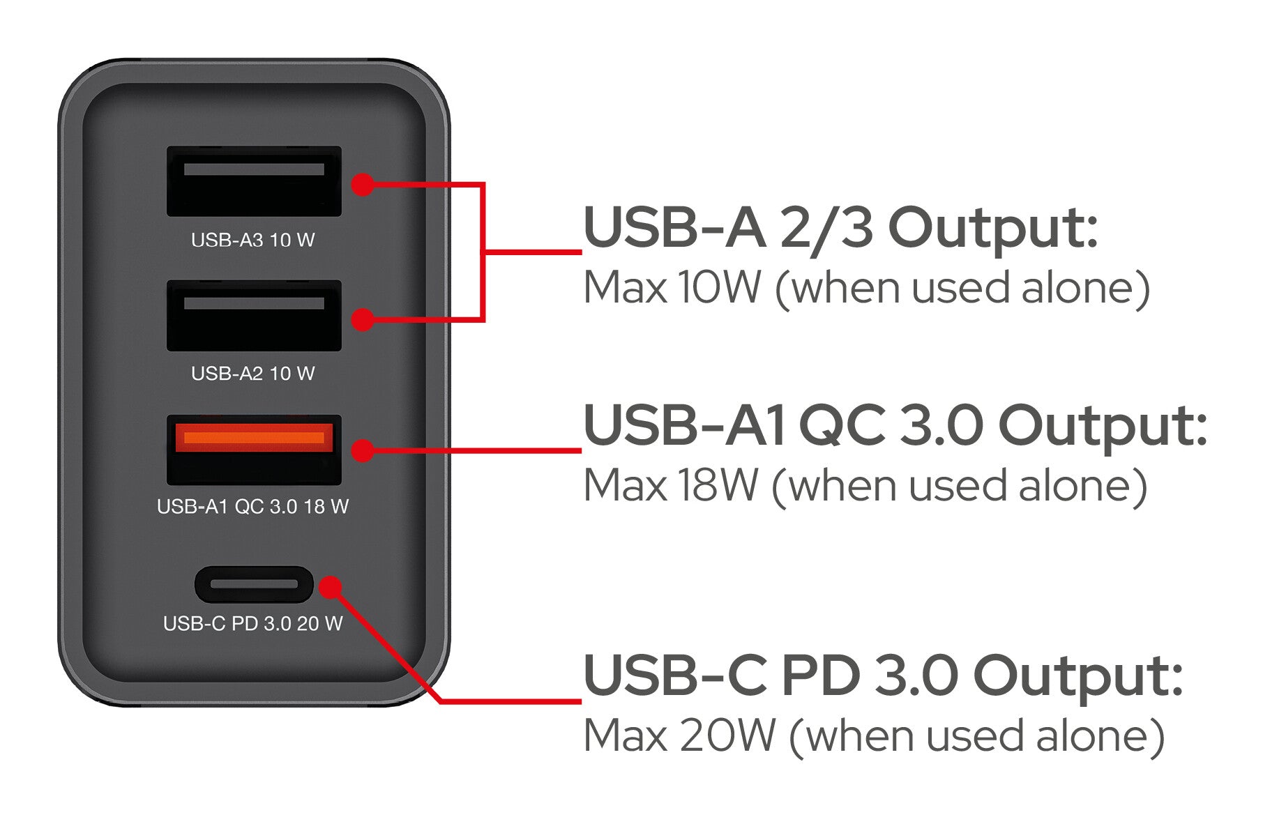 - Equipped with 1 x USB-C® port (PD 3.0 up to 20W), and three USB-A ports (1 x USB-A QC 3.0 up to 18W, 2 x USB-A up to 10W), total output up to 30W