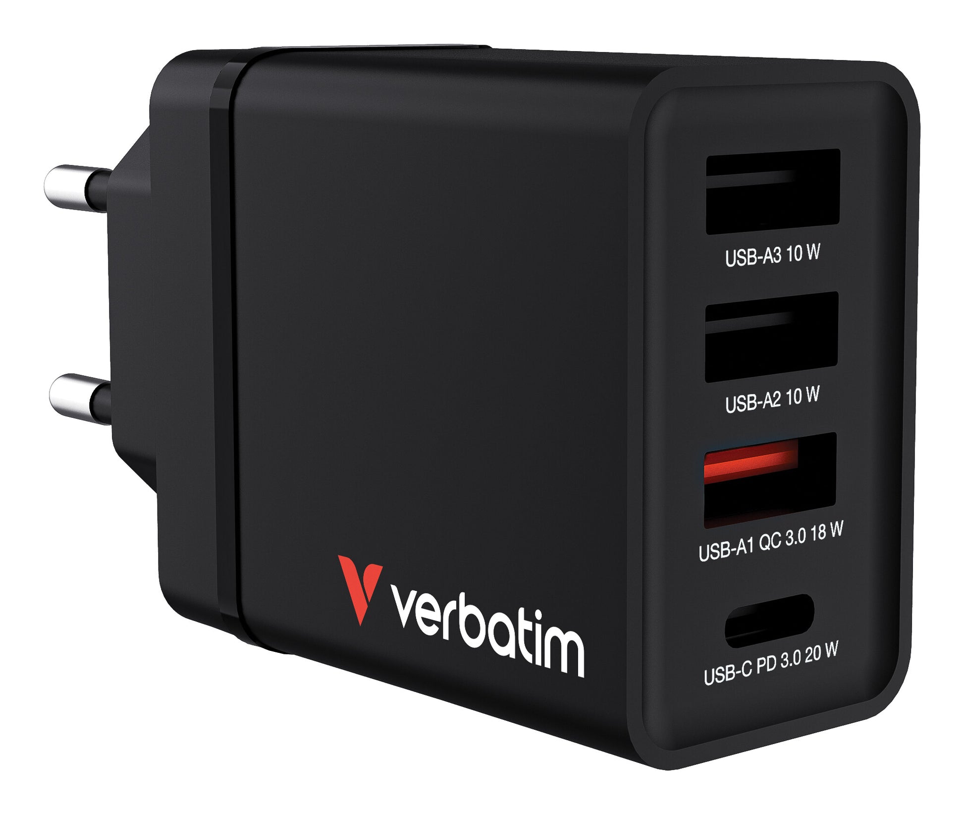 Verbatim’s 30W USB Wall Charger combines one USB-C PD 20W port, and three USB-A ports (one USB-A QC 3.0 18W port and two USB-A 10W ports) in a slim design with a fixed EU plug. Ideal for the office, home or travelling to power your tablet, smartphone, gaming devices, and more.