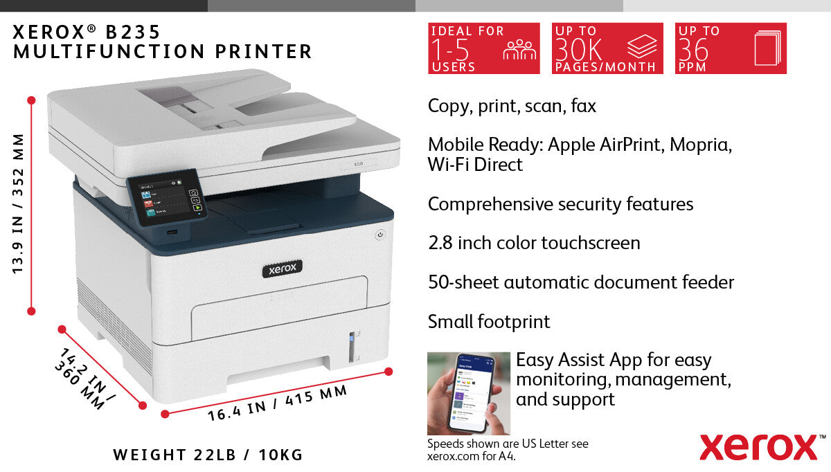- WORK FROM HOME: Perfect for small teams or home offices that need technology that fits in tight spaces and is easy to setup. The Xerox B235 is perfect for owners looking for a wireless black and white all-in-one printer.