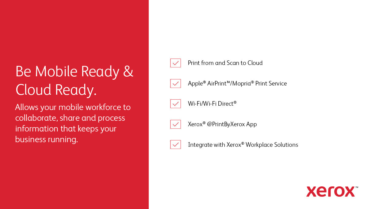 - Transform today’s digital workplace. Digitizing documents is quick and easy with the high-performance, single-pass scanner. Share files with ease with the Xerox App Gallery for direct access to Google Drive™, Microsoft® OneDrive® and DropBox™
